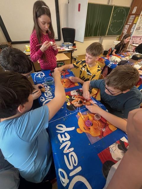 Děti si vyzkoušely tradiční zdobení vajíček voskem, ubrouskovou metodou , vyrábění závěsných vajíček na větvičky a další výrobky , které patří k Velikonocům.